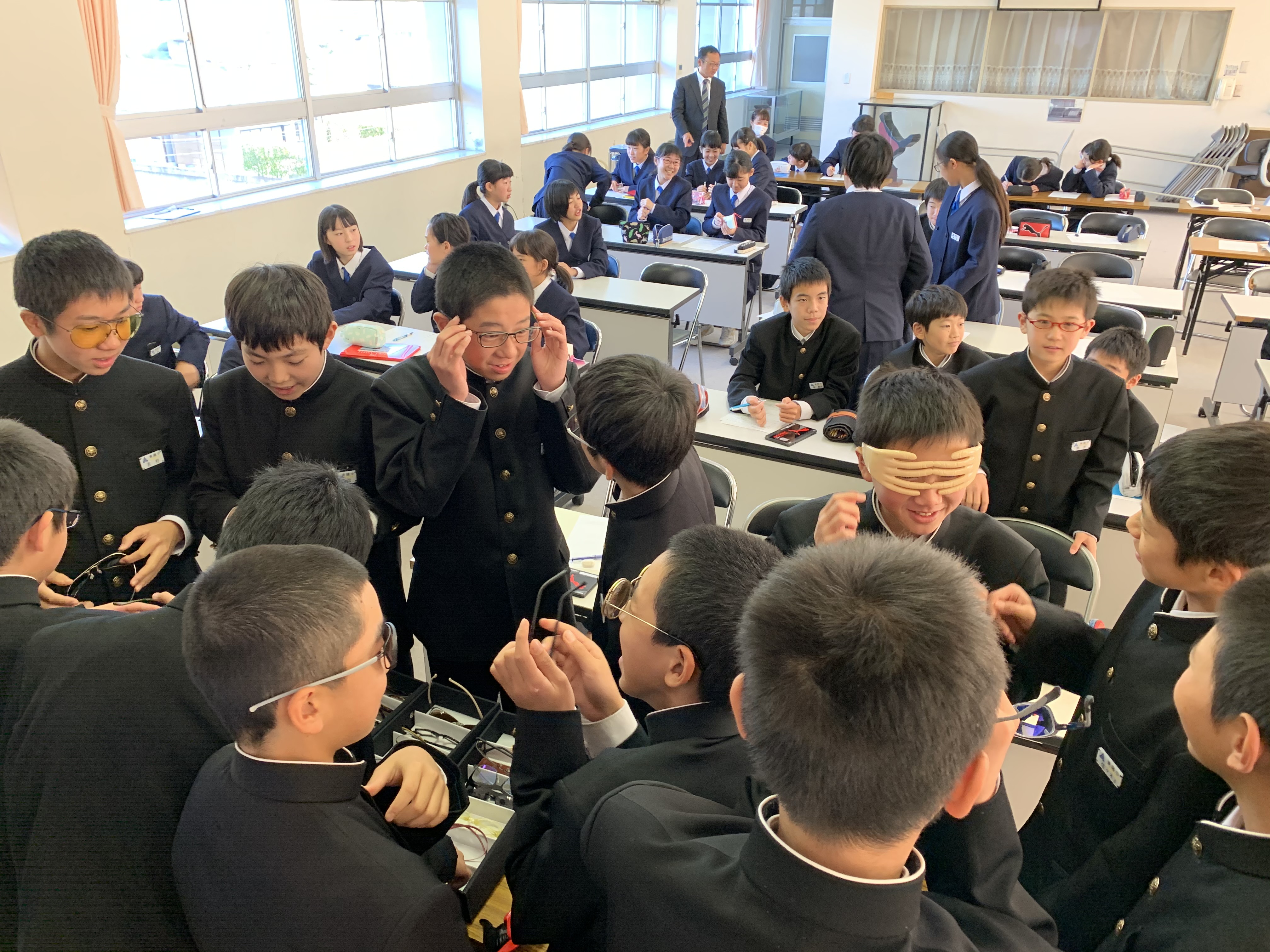 ・地元中学校で眼鏡デザインの授業を行なってきました。これは、産業教育支援事業の一環としてのもので、「テーマ決め」や「ラフスケッチ」、デザインなどを体験してもらいました。